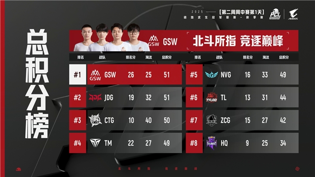 首日赛后,GSW凭借着59的总积分暂居第一,随后是17战队和PeRo战队,战神榜第一名则是给到了PeRo战队的Aixleft。