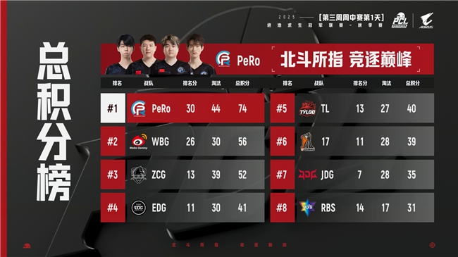 接下来的几场中,PeRo开始持续发力,不仅有吃鸡成功,在后续几场中也基本上都在TOP4中,最终让他们在本日的排名冲进了前4。