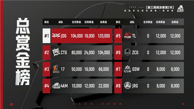 至此,PUBG的2025秋季赛常规赛阶段全部结束,而CTG则是成为了本次常规赛的榜首。在总赏金榜上,JDG战队以12万的总额高居第一,随后是CTG和17战队。