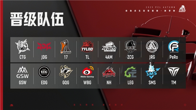 北斗所指,竞逐巅峰。绝地求生冠军联赛24支顶级战队分为A、B、C三组,经过常规赛、周中赛、周决赛的多轮对抗,正式角逐出了季后赛的名额。CTG战队后发制人,成功拿下常规赛第三阶段周冠军,17战队和4AM分别位居第2和第3。晋级PCL2025秋季赛总决赛的队伍分别是:CTG 、JDG 、17、TYLOO、4AM 、ZCG 、JRG 、PeRo 、GSW 、EDG 、GQG 、WBG 、NH、LEG、SMS 、TM,共16支战队。
